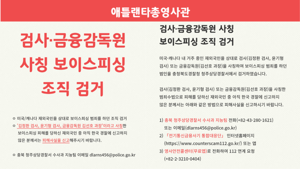 애틀랜타총영사관(총영사 이준호)은 검사와 금융감독원을 사칭해 미주 한인들을 대상으로 보이스피싱 범죄를 저지른 조직이 한국 경찰에 의해 검거됐다고 밝혔다.