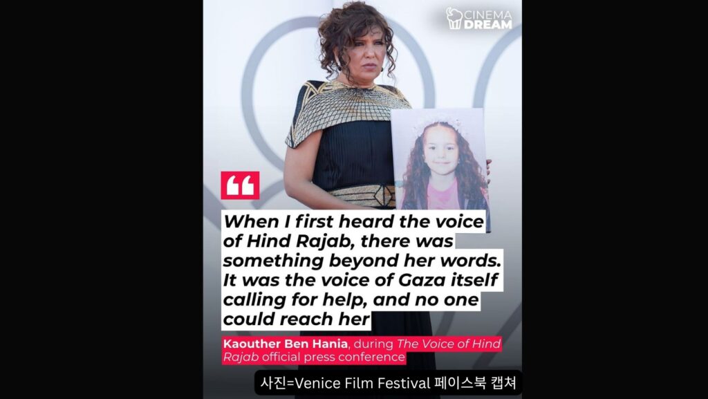 튀지니 출신 감독 카우더 벤 하니아가 연출한 90분 분량의 ‘힌드 라잡의 목소리’는 이번 베네치아 영화제 경쟁 부문에 진출했다.