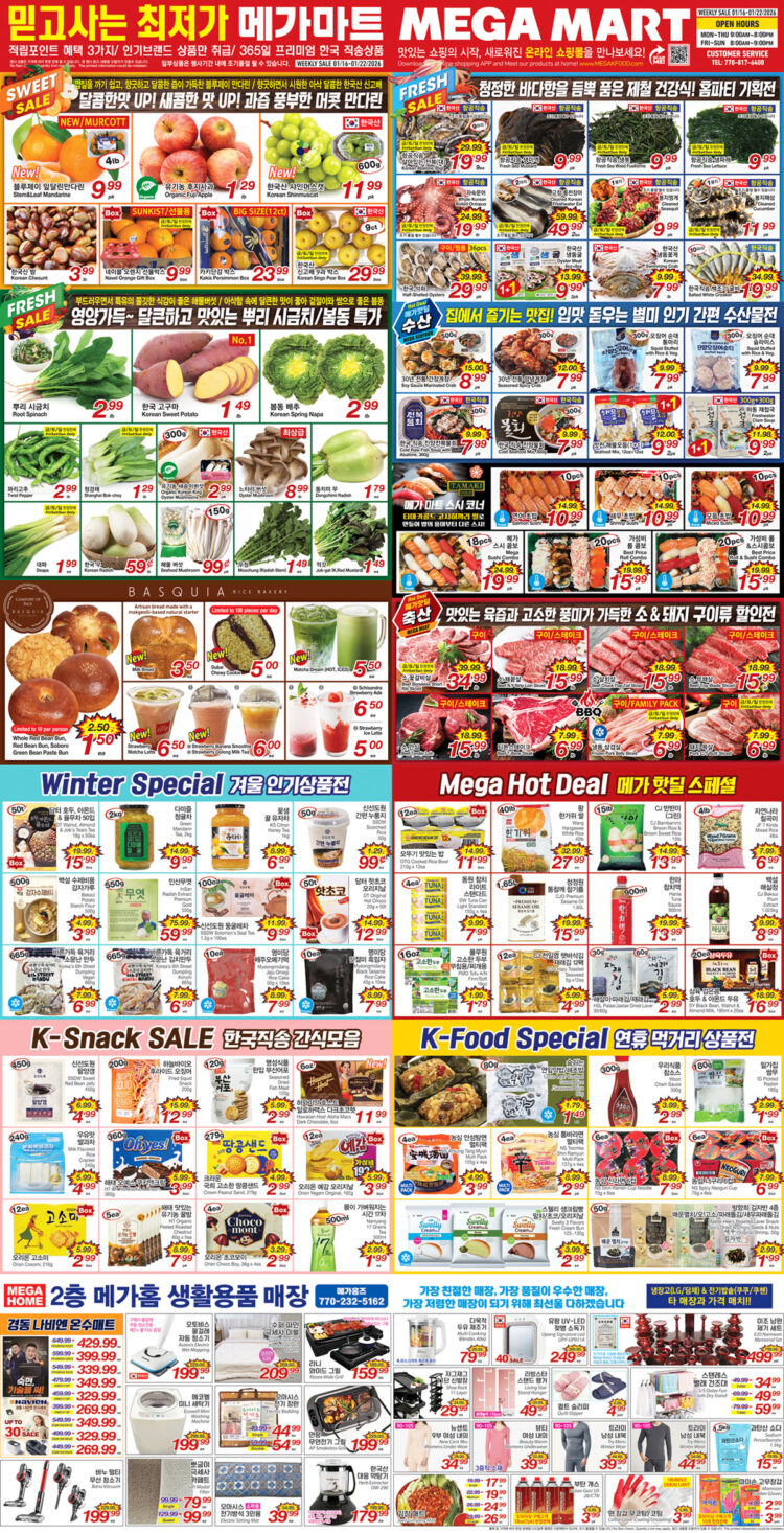 메가핫딜 상품으로는 ▲오뚜기 맛있는 밥 박스 11.99달러 ▲왕 한가위 쌀 40파운드 27.99달러 ▲CJ 반반미(그린) 13.99달러 ▲자연나라 칠곡미 6.99달러 ▲동원 참치 라이트 스탠다드 7.99달러 ▲청정원 통참깨 참기름 15.99달러 ▲한라 참치액 13.99달러 ▲백설 매실청 8.99달러 ▲풀무원 고소한 두부(부침용·찌개용) 각 1.79달러 ▲CJ 천일염 햇바삭김 재래김 12팩 4.99달러 ▲해살이 파래김·재래김 각 2.99달러 ▲삼육 검은콩 호두&아몬드 두유 박스 16.99달러 등이 마련됐다.