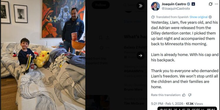로이터·AP통신에 따르면 호아킨 카스트로(민주·텍사스주) 연방 하원의원은 엑스(X·옛 트위터)를 통해 텍사스주 딜리의 구금 시설에 억류돼 있던 5세 어린이 리암 코네호 라모스와 그 아버지가 미니애폴리스 교외 자택으로 돌아왔다고 밝혔다.