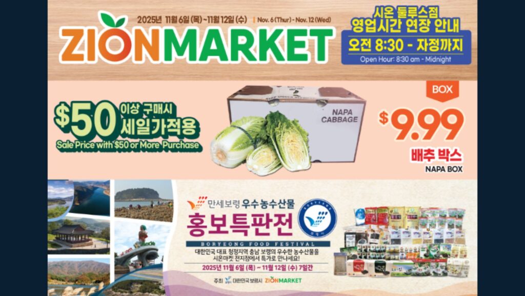 둘루스 소재 시온마켓이 6일(목)부터 12일(수)까지 가을맞이 특별 세일과 함께 ‘만세보령 우수 농수산물 홍보 특판전’을 진행한다.
