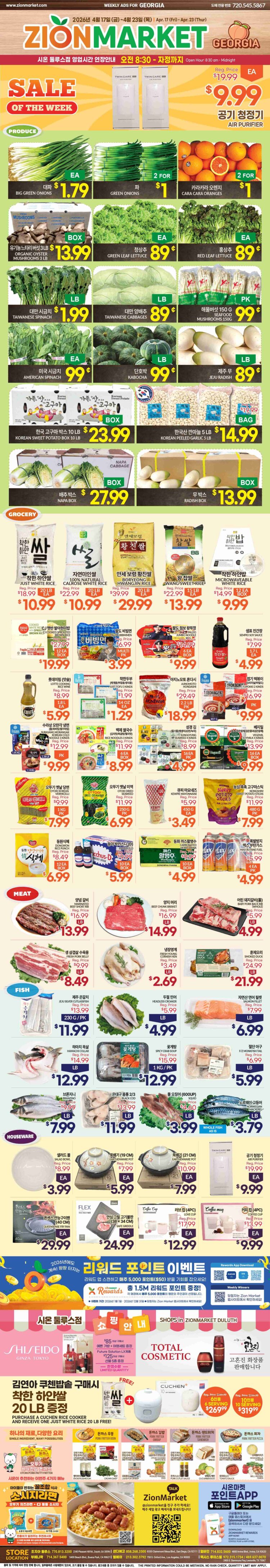 둘루스에 위치한 시온마켓 둘루스점이 17일(금)부터 4월 23일(목)까지 생활가전부터 식료품까지 다양한 품목이 할인되며, 특히 공기청정기가 파격가로 판매돼 눈길을 끌고 있다.