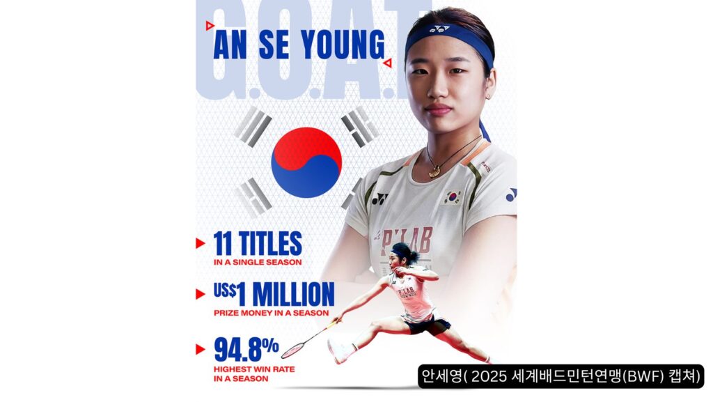 시즌 11승을 달성하며 남녀 통합 역대 최다승 타이기록을 세운 ‘세계 최강’ 안세영은 올 시즌 누적 상금도 역대 최고액을 달성했다.
