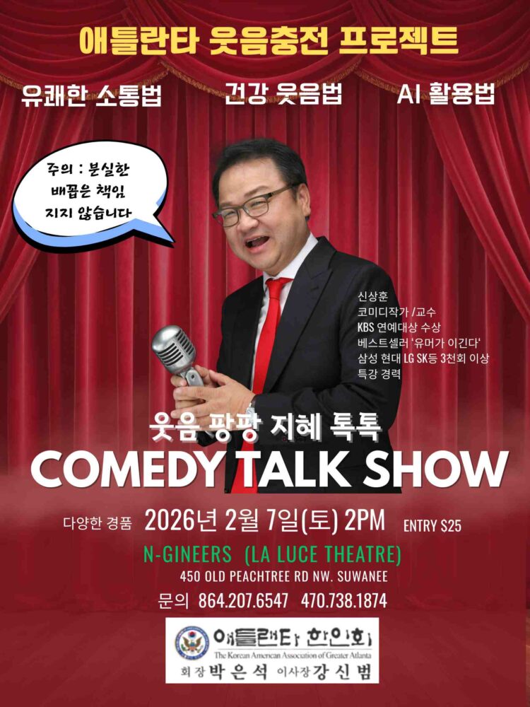 애틀랜타 한인회(회장 박은석)는 2026년 새해를 맞아 국내 최고의 유머 소통 강연자 신상훈 씨를 초청해 특별 코미디 톡 쇼 ‘웃음 충전 프로젝트’를 개최한다.
