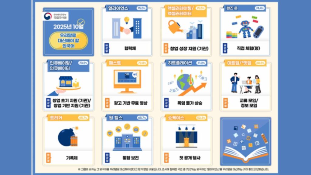 이번 조사에서 국민이 우리말로 바꿔 써야 한다고 가장 많이 선택한 외래 용어는 ‘얼라이언스'(75.5%)와 ‘액셀러레이팅/액셀러레이터'(75.5%)였다.