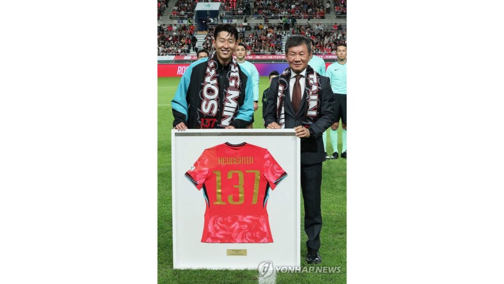 손흥민은 두 손으로 얼굴을 감싸 쥐며 감격스러움을 표했고, 차 전 감독은 손흥민의 영문 이름과 ‘137’이 새겨진 유니폼 액자를 선물했다.