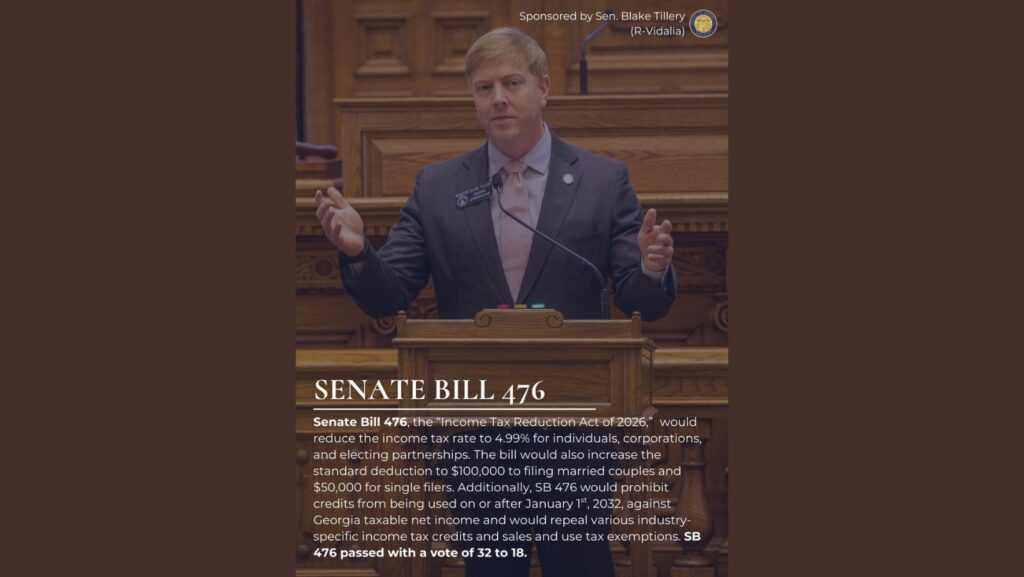 법안을 발의한 블레이크 틸러리 상원의원(공화·비달리아)은 “SB 476은 조지아 가정에 직접적이고 실질적인 구제를 제공하는 법안”이라며 “생활비 상승으로 어려움을 겪는 근로 가정을 돕기 위한 조치”라고 강조했다. 그는 “조지아가 가장 매력적인 주로 성장해온 성과를 주민들의 세금 부담 완화로 돌려줘야 한다”고 밝혔다.