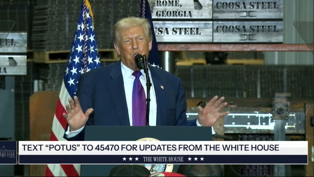 트럼프 대통령은 롬 지역 철강업체 쿠사 스틸(Kusa Steel)을 찾아 외국산 철강에 대한 50% 관세 정책이 업계를 되살렸다고 주장했다. 그는 “관세는 내가 가장 좋아하는 단어”라며 “관세가 없었다면 미국 철강 산업은 심각한 위기에 처했을 것”이라고 말했다.