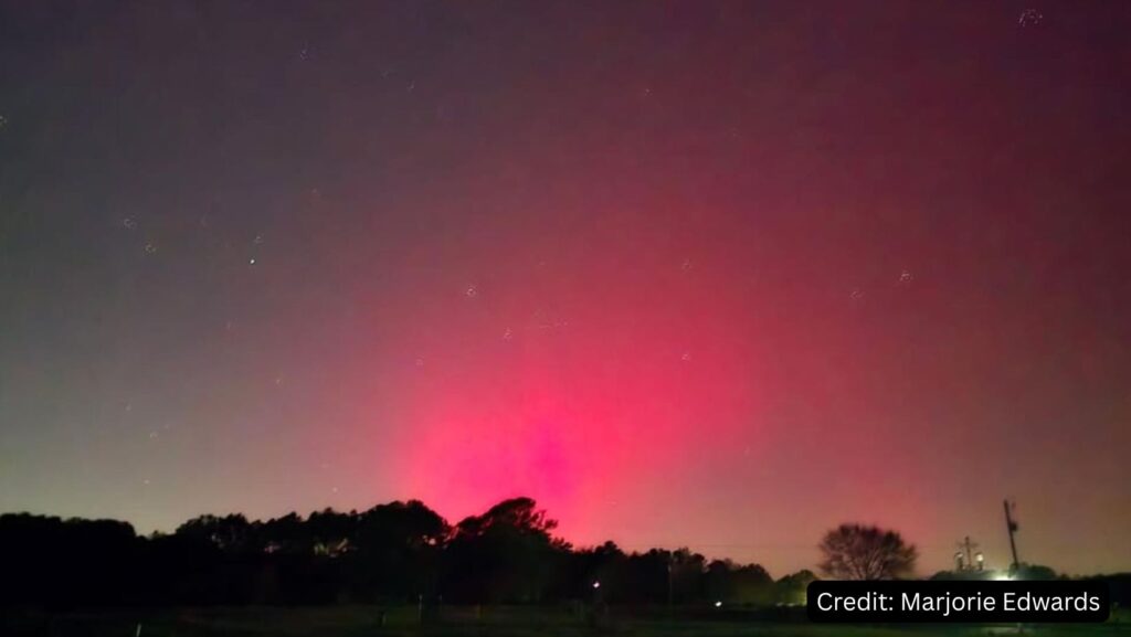 게인즈빌과 바토카운티 상공에서는 강력한 지자기 폭풍의 영향으로 붉은빛과 자줏빛이 어우러진 희귀한 장관이 펼쳐졌다.