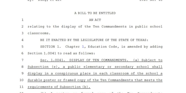 수정헌법 1조는 종교의 자유와 함께 정부가 종교를 정하는 것을 금지하고 있지만 텍사스주 의회는 지난해 6월 모든 공립학교 교실에 십계명을 게시하도록 한 법안(SB10)을 통과시켰다.