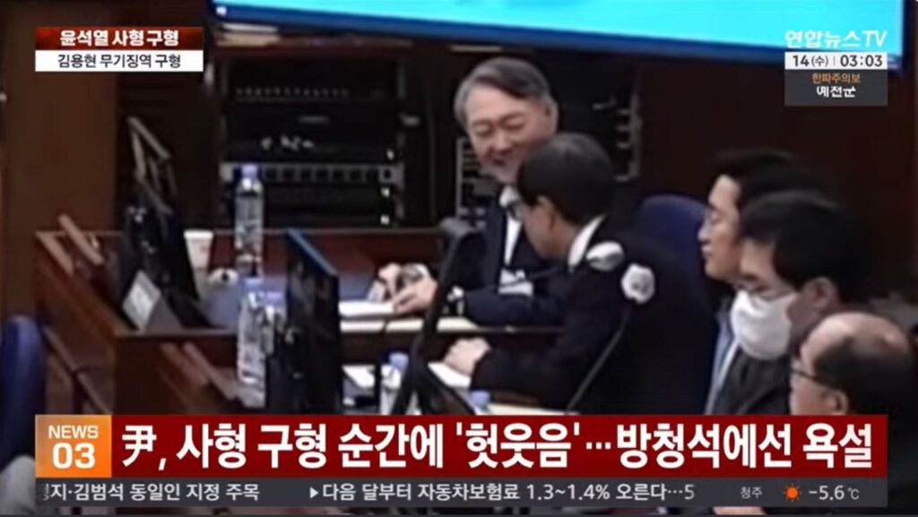 이어 “사형을 구형합니다”라고 박 특검보가 말하자 윤 전 대통령은 어이가 없다는 듯 씨익 웃음을 내보였다.