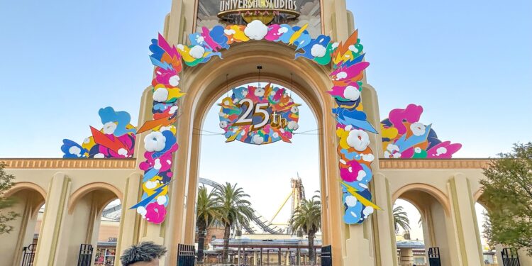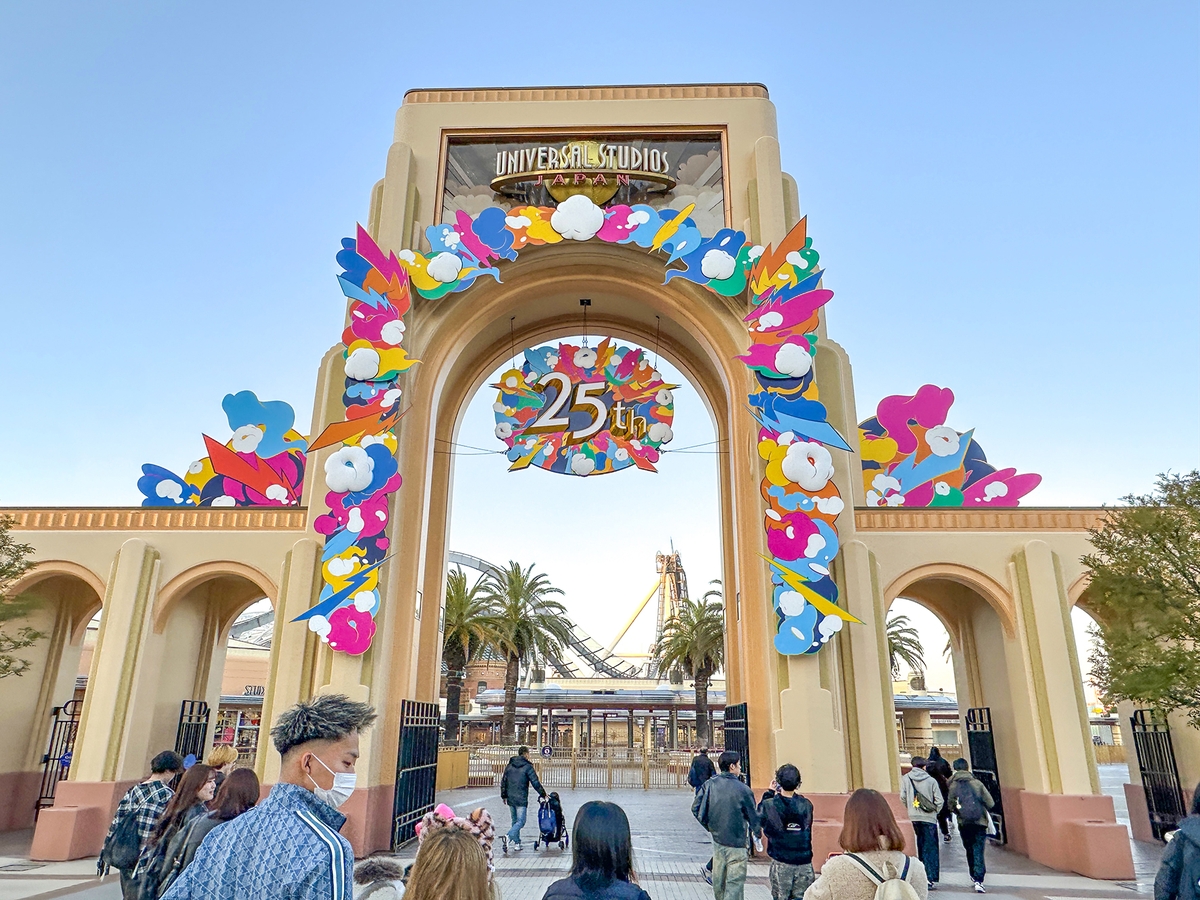 정문 아치에 ’25주년’을 알리는 원색의 그림판이 걸려 있다. USJ 설립 25주년이자 동시에 슈퍼 닌텐도 월드 5주년이다.