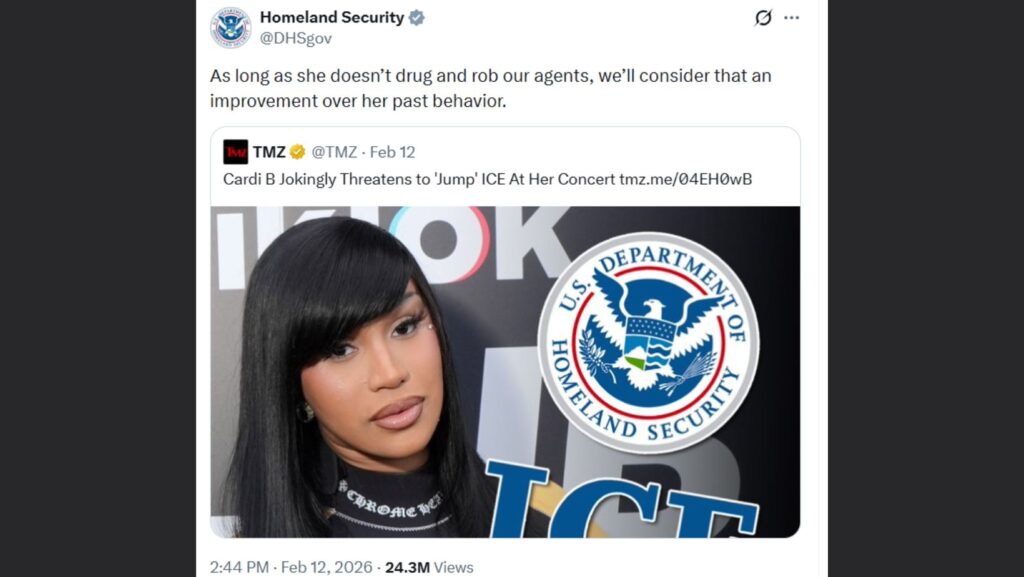 이전부터 민주당을 지지해왔고, 최근 인터뷰에서도 배드 버니가 그래미 어워즈 시상식에서 “ICE 아웃”을 외친 것을 칭찬한 카디 비의 성향을 고려하면 나올 법한 발언이었지만, 국토안보부는 이를 그냥 넘기지 않았다.