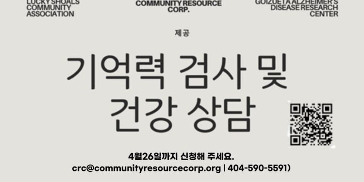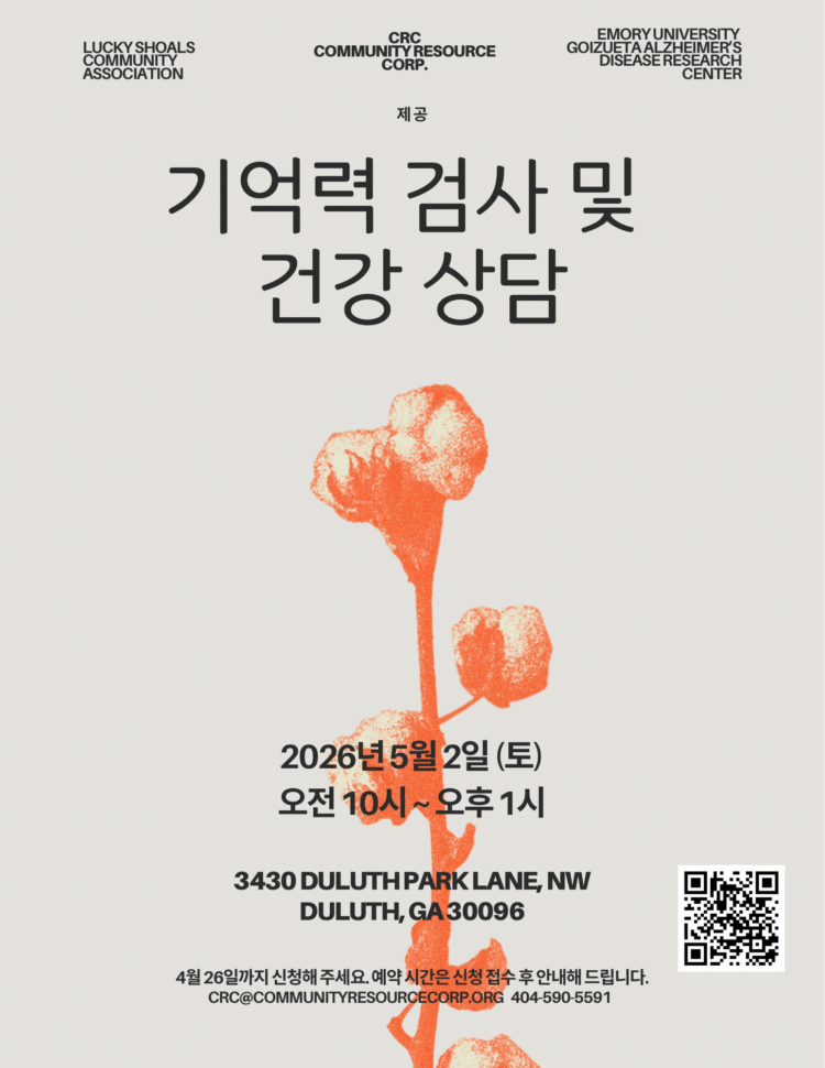 행사는 5월 2일(토) 오전 10시부터 오후 1시까지 둘루스에서 진행된다. 전문 인력이 참여해 간단한 인지 기능 평가를 실시하고, 결과에 따라 필요한 건강 관리 방향을 안내할 예정이다.