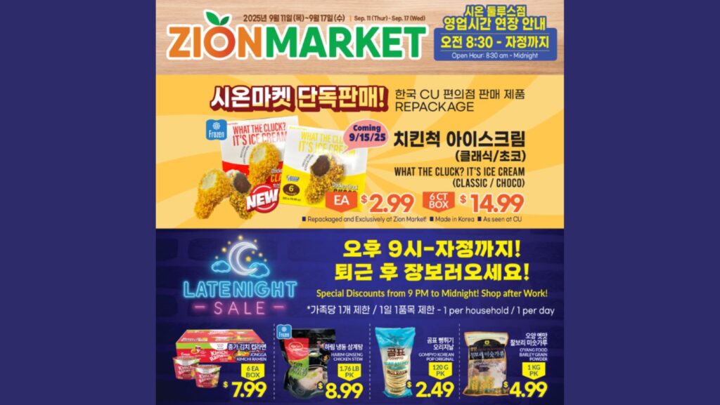 시온마켓 측은 “퇴근 후 장을 보러 오는 고객들을 위해 자정까지 다양한 할인 혜택을 마련했다”며 “앞으로도 한국과 현지의 인기상품을 발굴해 한인사회에 제공할 것”이라고 전했다.
