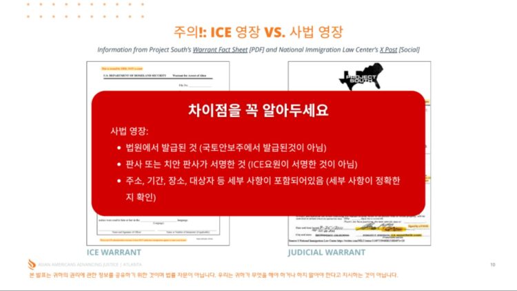 발표자로 나선 제임스 우 AAAJ 대외협력부장은 ICE의 역할과 단속 방식을 설명했다. ICE는 표식 없는 차량과 사복을 사용하며, FBI나 지역 경찰 등을 사칭할 수 있다. 우 부장은 “조지아 주의 HB1105 법안으로 경찰과의 접촉이 ICE 접촉으로 이어질 가능성이 높아졌으며, 테네시와 앨라배마 등 인근 주에서도 유사 정책이 시행 중”이라고 전했다.