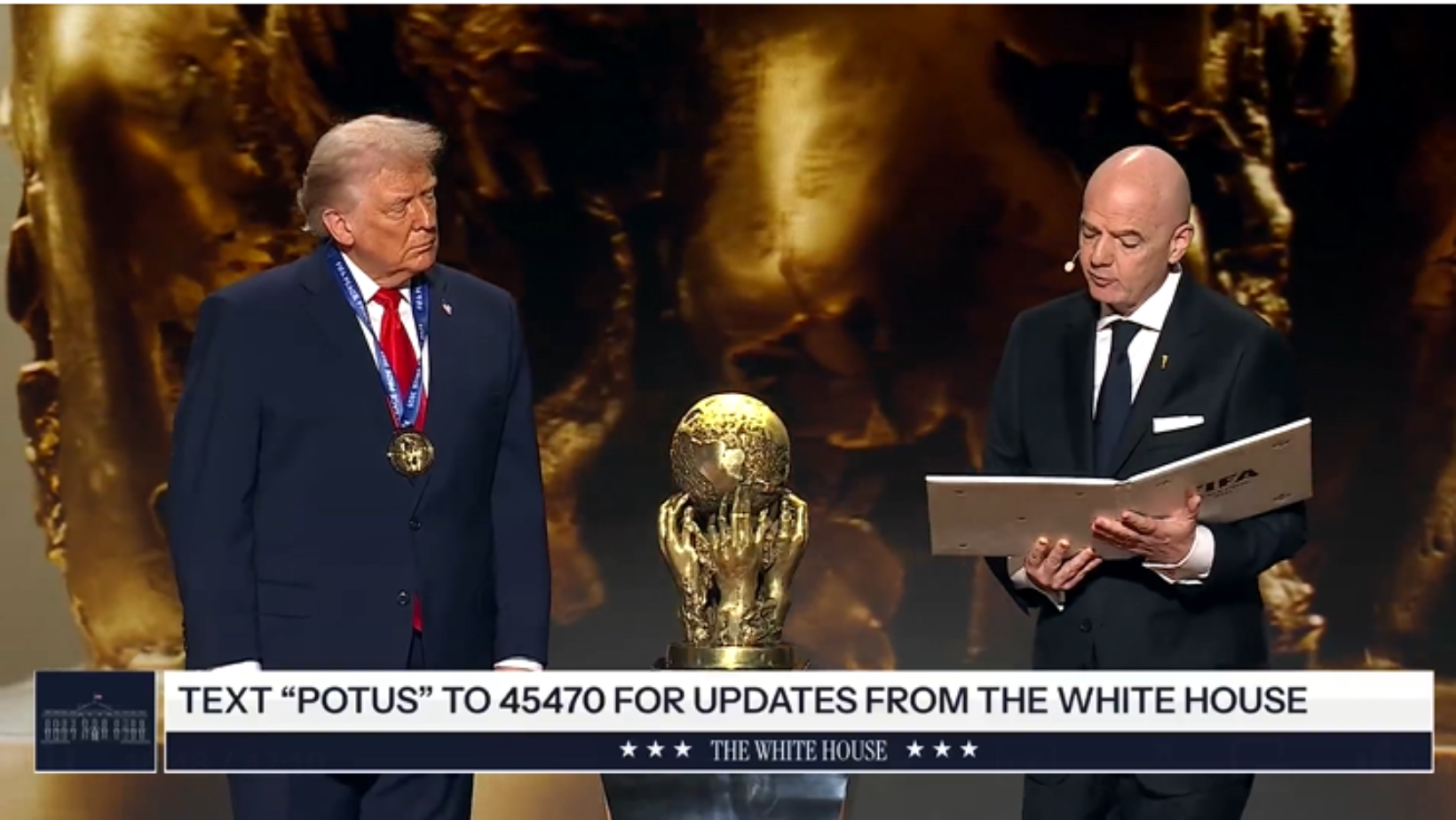 잔니 인판티노 FIFA 회장은 이날 미국 워싱턴DC 케네디 센터에서 열리는 2026 북중미 월드컵 본선 조 추첨식 무대에서 트럼프 대통령에게 평화상을 수여했다. 인판티노 회장은 트럼프 대통령에게 메달과 함께 인증서를 전달했다.