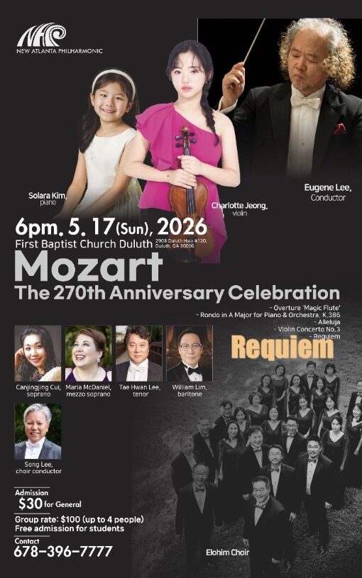 뉴애틀랜타 필하모닉(음악감독 유진 리)이 ‘음악의 천재 ‘모차르트’ 탄생 270주년을 기념하는 특별 연주회를 오는 5월 17일 오후 6시 둘루스 제일침례교회(First Baptist Church of Duluth)에서 개최한다.