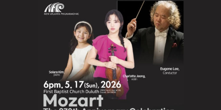 뉴애틀랜타 필하모닉(음악감독 유진 리)이 ‘음악의 천재 ‘모차르트’ 탄생 270주년을 기념하는 특별 연주회를 오는 5월 17일 오후 6시 둘루스 제일침례교회(First Baptist Church of Duluth)에서 개최한다.