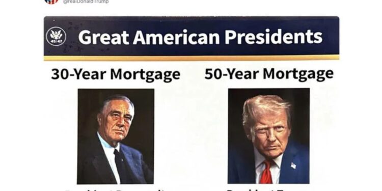 트럼프 대통령이 50년 모기지 정책을 추진하면 루스벨트와 함께 미국에서 손꼽히는 위대한 대통령이 될 것이라는 메시지로 읽힌다.