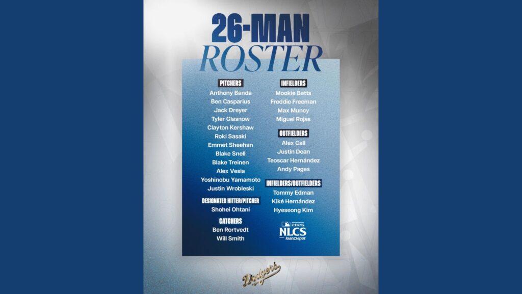 다저스는 14일(한국시간) 2025 MLB 내셔널리그 챔피언십시리즈(7전 4승제) 밀워키 브루어스와 경기에 나갈 선수 26명 명단을 발표했다.