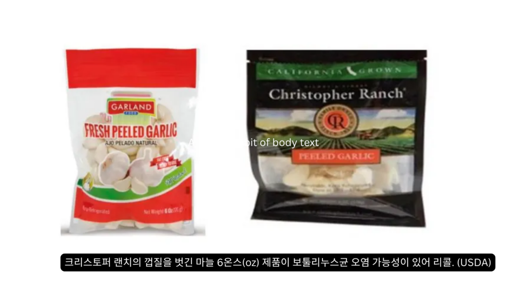 리콜 대상은‘크리스토퍼 랜치 껍질 벗긴 마늘’ 6온스 제품(UPC 74574-10852)과 ‘가랜드 프레시 껍질 벗긴 마늘’ 6온스 제품(UPC 71894-00000, 68826-75340)으로, 모든 생산일자가 포함된다.
