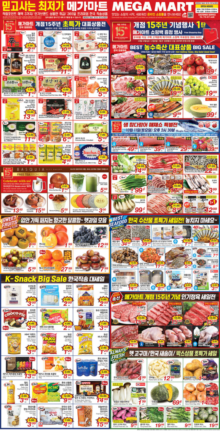 이 밖에도 금·토·일 한정으로 국물 멸치 박스 $22.99, 오징어 파운드 $3.99, 황태채 2팩 $12.99, 한국 배추 박스 $14.99, 총각무 3ea $0.99 등 다양한 식재료가 할인된다. 육류와 냉동 상품, 한국 대표 마트 인기 상품들도 초특가로 판매된다.