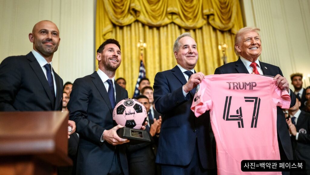 지난 5일(현지시간) 메시를 포함한 인터 마이애미 선수단은 2025 메이저리그사커(MLS) 우승팀 자격으로 백악관을 방문해 트럼프 대통령과 악수하고 기념 촬영을 했다.