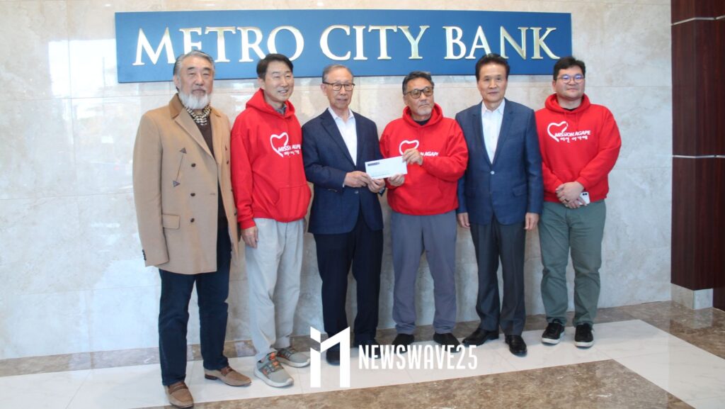 메트로시티은행(회장 백낙영, 행장 김화생)은 22일 오후 도라빌 본점에서 미션아가페(회장 제임스 송)에 ‘사랑의 점퍼’ 나눔을 위한 성금 5,000달러를 전달했다.