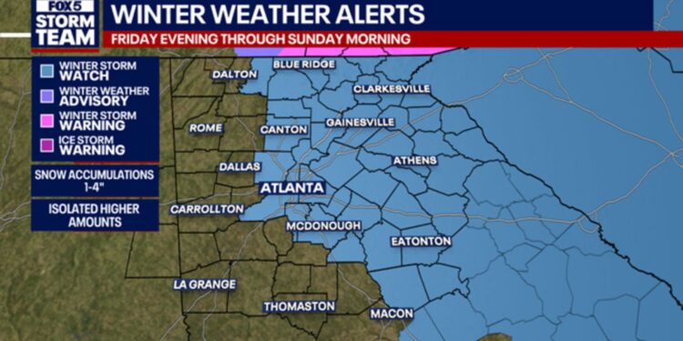 메트로 애틀랜타 전역에 이번 주말 또 한 차례 겨울폭풍이 예보되면서 국립기상청(NWS)이 ‘겨울폭풍 주의보’를 대폭 확대했다. 당초 북동부 조지아에 국한됐던 경보 구역이 저기압 이동 경로 변화로 인해 애틀랜타 메트로 대부분 지역으로 확장됐다.
