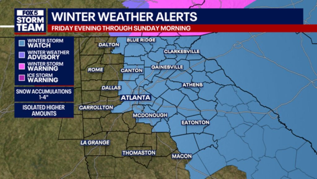 이번 겨울폭풍 주의보에는 풀턴, 디캡, 캅, 귀넷, 클레이튼, 락데일, 뉴턴 카운티가 포함됐다.