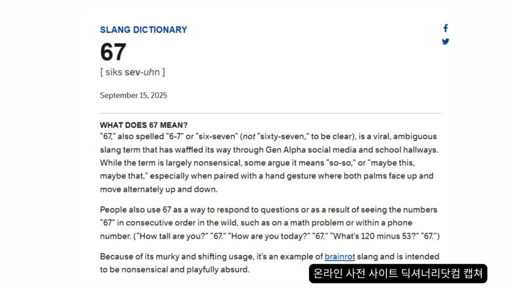 미국의 온라인 사전 사이트 딕셔너리닷컴(Dictionary.com)이 올해의 단어로 10대의 유행어 ’67’을 선정했다고 AP통신이 9일(현지시간) 보도했다.
