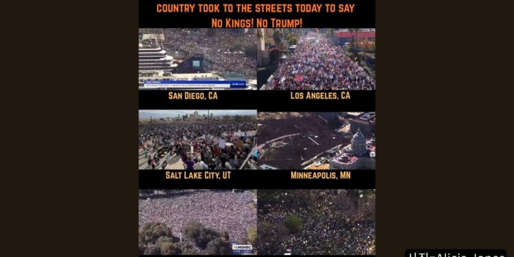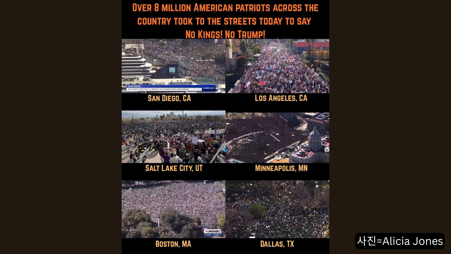 ‘노 킹스'(No Kings·왕은 없다)라는 이름의 대규모 시위는 지난해 6월과 10월에 이어 이번이 세 번째다.