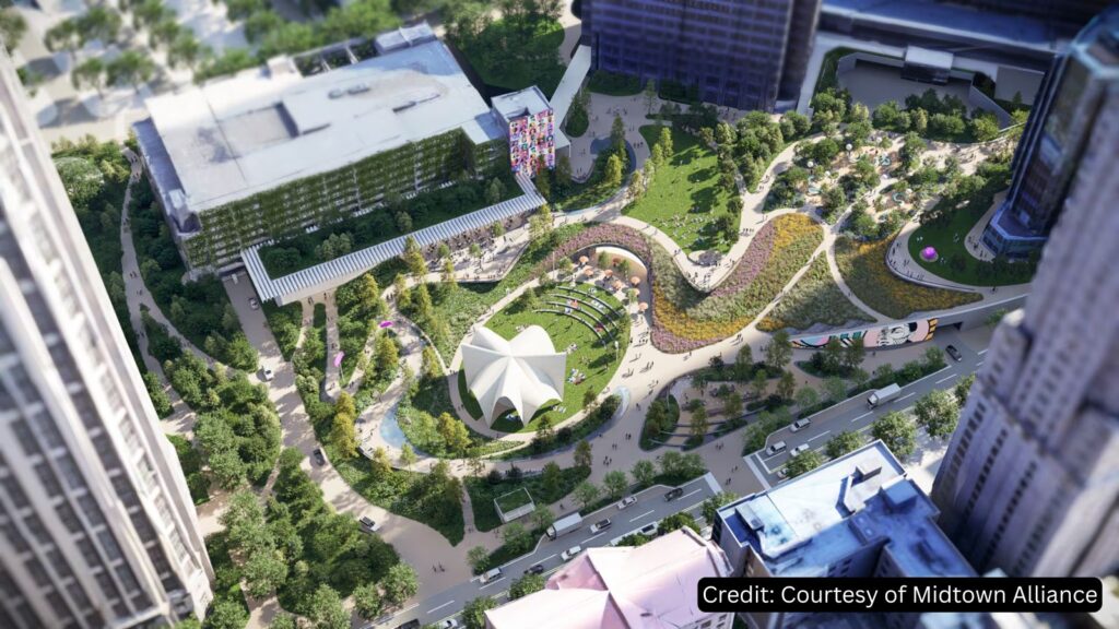 지역 비영리 단체 Midtown Alliance는 최근 연례 회의를 통해 ‘미드타운 그린(Midtown Green)’ 개발 구상을 공개하고 본격적인 추진에 나섰다. 대상지는 14번가(98 14th St.) 인근으로, 주요 공연장과 문화시설이 밀집한 미드타운 핵심 입지다.