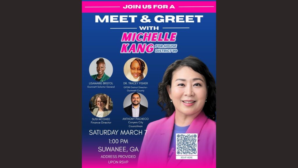 조지아주 하원 99선거구(스와니·슈가힐 및 둘루스 일부 지역)에 출마한 미쉘 강 후보가 오는 7일(토) 오후 1시 스와니에서 지역 주민 및 유권자들과 직접 소통하는 ‘유권자와의 만남(Meet & Greet)’ 행사를 개최한다.
