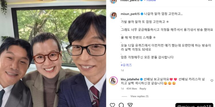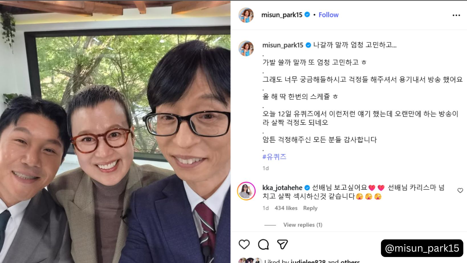 이날 자신의 인스타그램에 ‘유퀴즈’ 진행자 유재석, 조세호와 함께 찍은 사진을 게재하고 “올해 딱 한 번의 스케줄”이라고 설명을 달았다. 이 게시물은 지난 5월 28일 이후 처음 올린 것이다.