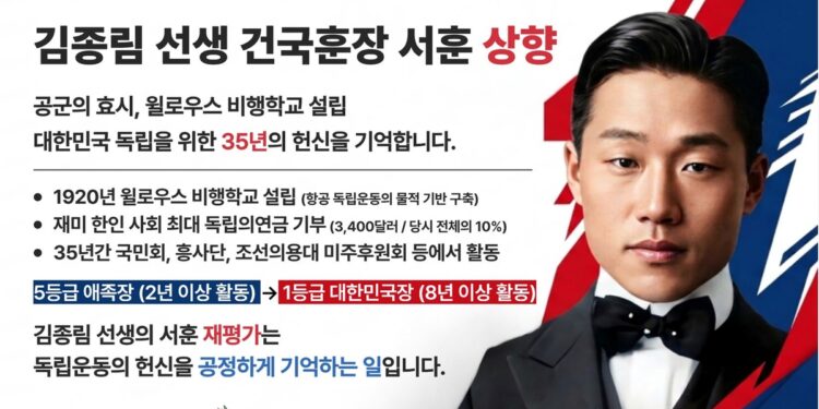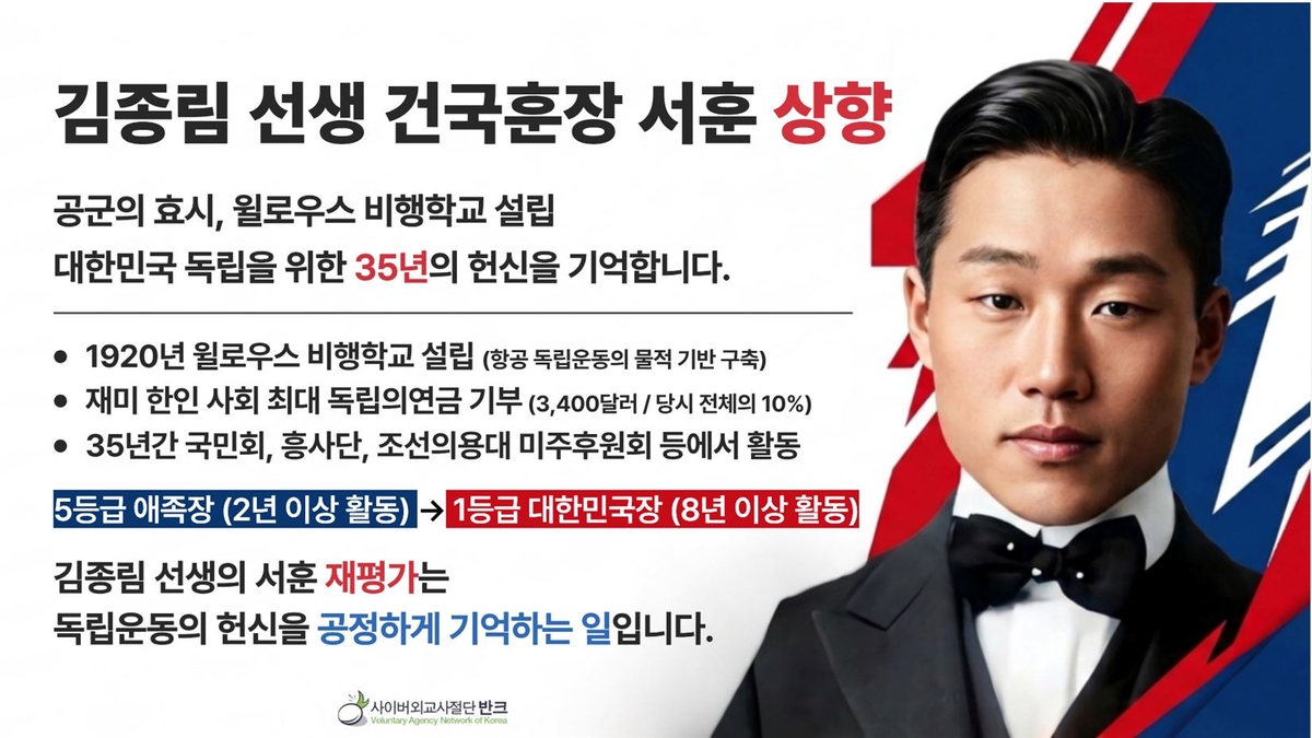 사이버외교사절단 반크는 1920년 미국 캘리포니아 윌로우스에서 한인 비행사양성소를 설립한 독립운동가 김종림 선생의 건국훈장 등급을 현행 5등급 애족장에서 상향 조정할 것을 촉구하는 글로벌 캠페인을 전개한다고 22일 밝혔다.