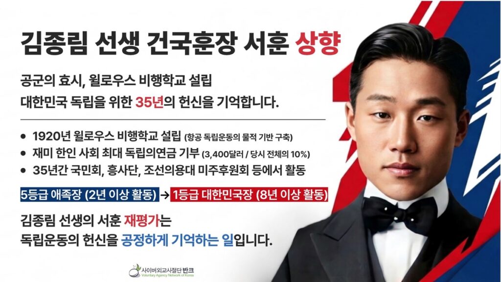 독립유공자 서훈 공적 심사 일반기준에 따르면 1~3등급은 활동기간 8년 이상, 애족장(5등급)은 2년 이상을 기준으로 한다. 김종림 선생의 35년 활동은 이 기준을 크게 상회하며, 독립의연금 단일 최대 기부와 비행학교 설립 자금 전액 부담은 상훈법 제3조가 규정하는 공적 내용과 국가·사회에 미친 효과 측면에서도 현행 5등급 애족장과의 간극이 재검토되어야 할 근거가 된다고 반크는 설명했다.
