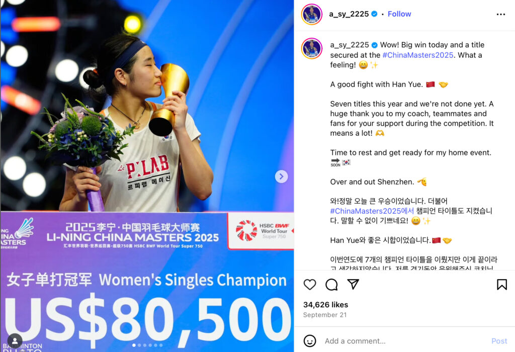 안세영이 프랑스오픈 정상을 밟은 건 2019년과 2024년에 이어 올해가 3번째다.