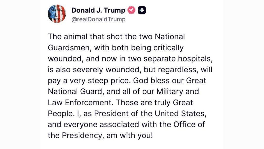 크리스티 놈 국토안보부 장관은 엑스(X·옛 트위터)에서 이같은 사실을 알렸다. 총에 맞은 군인들은 중태라고 AP 통신이 전했다.