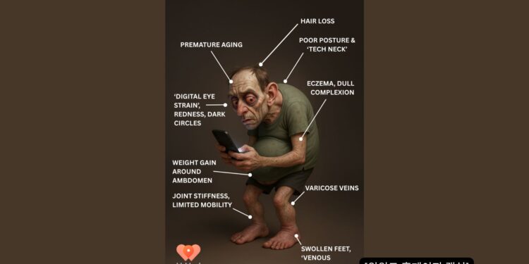 장시간 앉아 오랜 시간 구부정한 자세로 스마트폰을 봤기 때문에 머리가 앞으로 기울어지고 상체는 굽은 거북목이다.