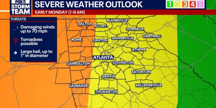 기상당국은 15일(일) 오후부터 산발적인 비와 뇌우가 시작되고, 본격적인 폭풍전선은 16일(월) 새벽 1시경 북서부 조지아에 진입해 오전 8시 전후까지 동쪽으로 이동할 것으로 전망했다.