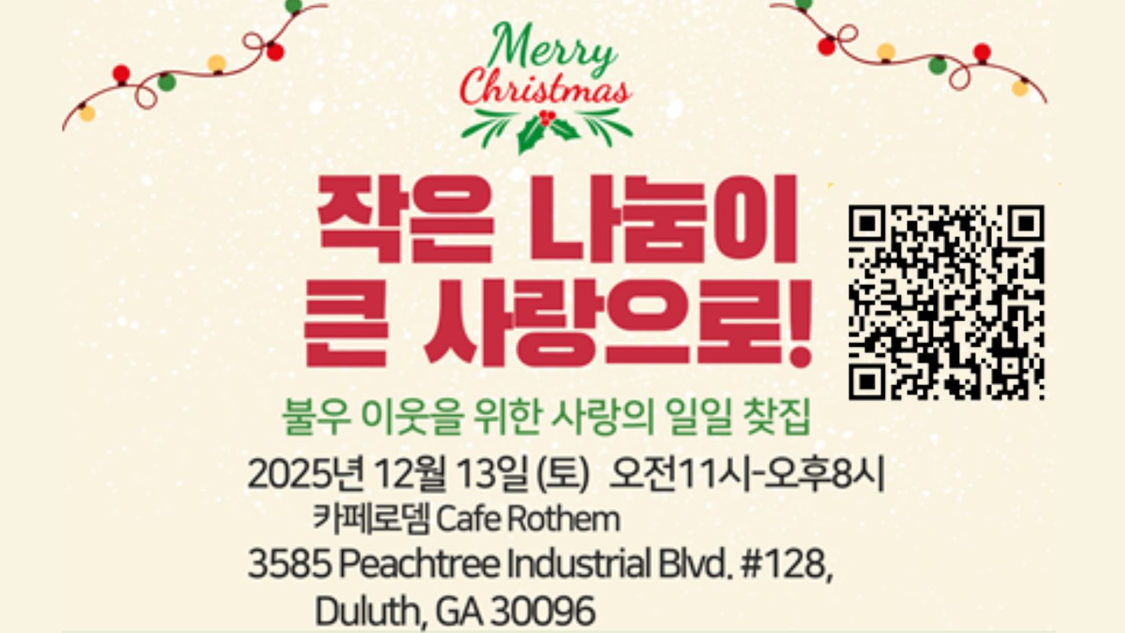 오는 13일(토) 오전 11시부터 오후 8시까지 둘루스 카페로뎀에서 진행되며, 수익금 전액은 어려운 이웃을 위한 후원에 사용될 예정이다.