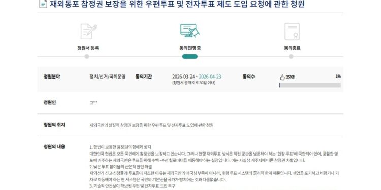 세계한인총연합회(이하 세한총연·회장 고상구)는 재외국민의 실질적인 참정권 보장을 위해 우편투표 및 전자투표 도입에 관한 ‘공직선거법 개정 국민동의청원’을 추진한다고 25일 밝혔다.