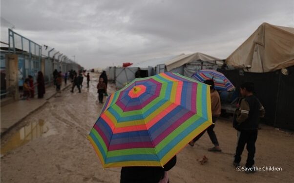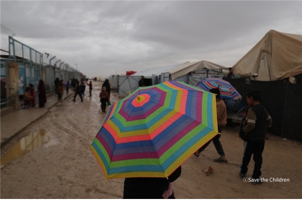 시리아 북동부 난민촌에서 세이브더칠드런이 나눠준 우산을 들고 있는 아동들[세이브더칠드런 제공]