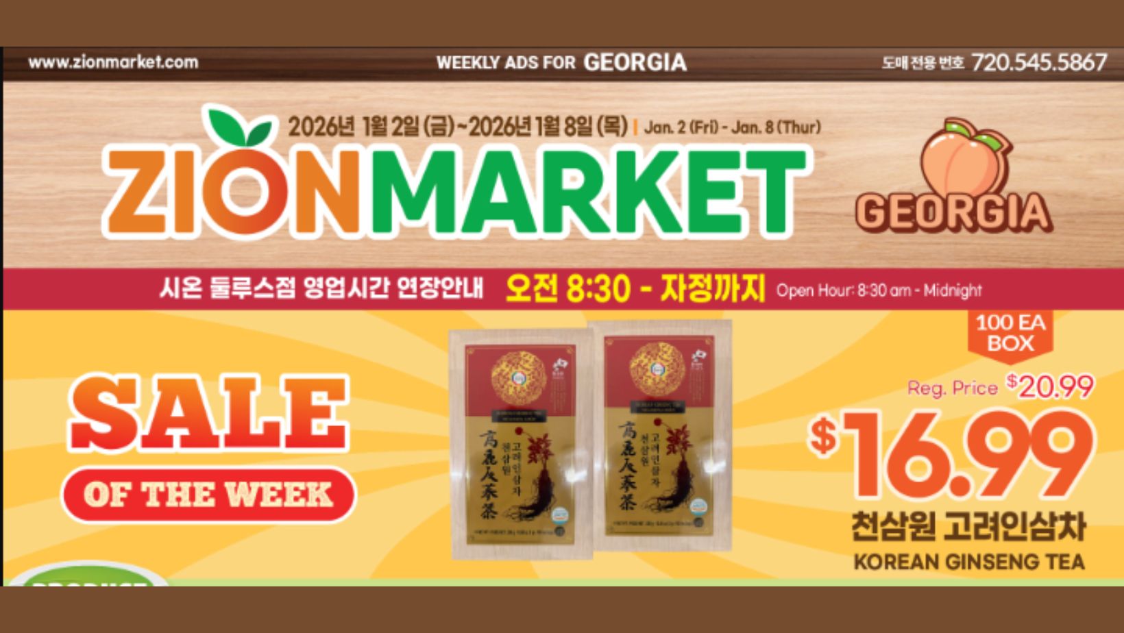 둘루스에 위치한 시온마켓(Zion Market)이 2일부터 8일까지 천삼원 고려인삼차를 16.99달러 특별 할인가에 제공한다.
