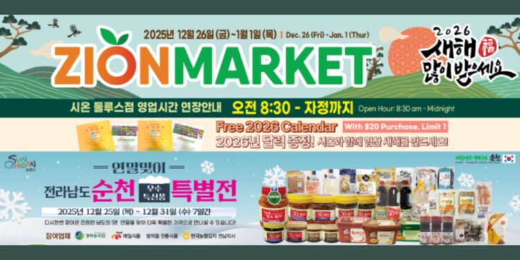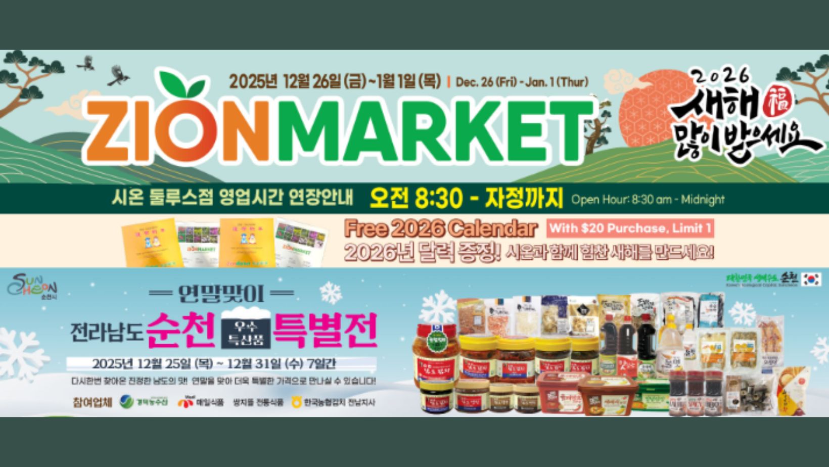 시온마켓은 고객 편의를 위해 오전 8시 30분부터 자정(12시)까지 영업하며 20달러 이상 구매 고객에게는 2026년 탁상용 달력이 무료로 증정되는 특별 이벤트도 함께 마련됐다.