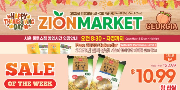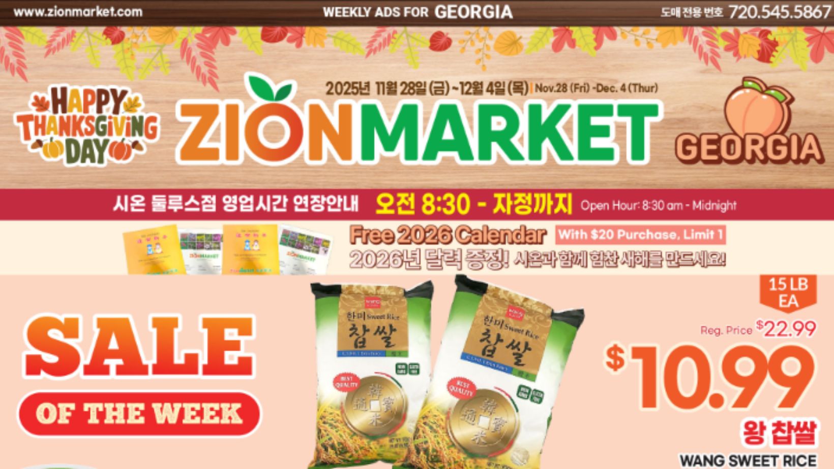 둘루스에 위치한 시온마켓이 오는 11월 28일(금)부터 12월 4일(목)까지 특별 할인 행사를 진행한다.
