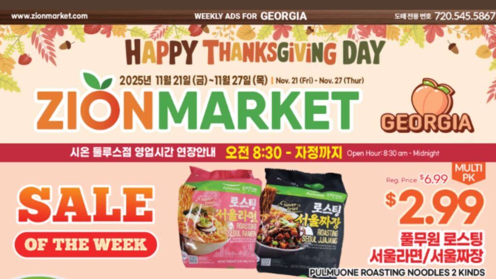 둘루스에 위치한 시온마켓이 추수감사절을 맞아 20일(목)부터 27일(수)까지 특별 할인 행사를 진행한다.