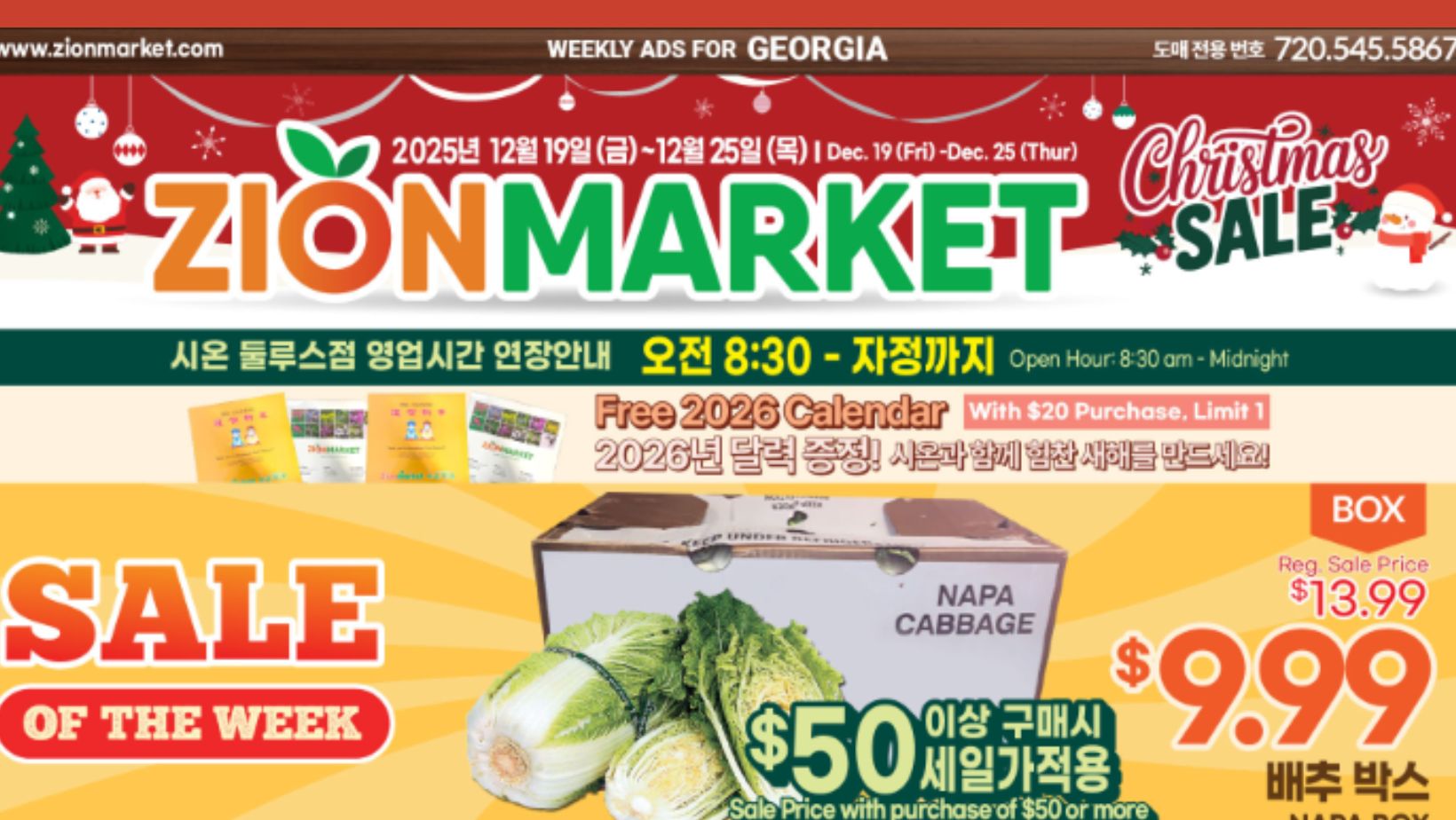 시온마켓은 고객 편의를 위해 오전 8시 30분부터 자정(12시)까지 영업하며 20달러 이상 구매 고객에게는 2026년 탁상용 달력이 무료로 증정되는 특별 이벤트도 함께 마련됐다.